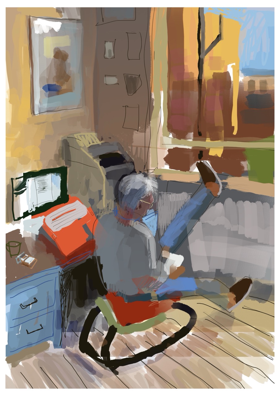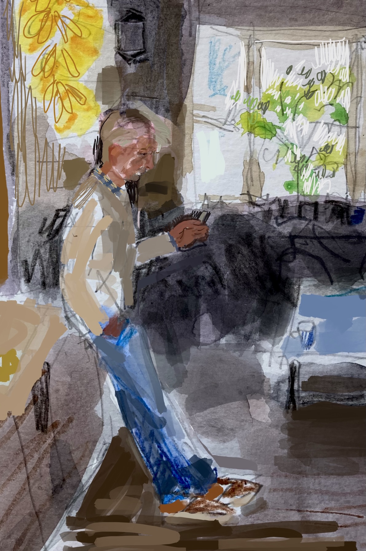 This is the publisher I visited last week, as reported in a previous post that showed only photos. While I was with Charles Boyle, I made many sketches using pen on paper, and, one picture using my iPad which lets me work with vibrant colour quickly.